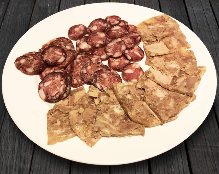 This cold cut is based on a peasant dish that originated in Europe and has been made since the Middle Ages. Traditional versions are made with the head of the animal and go by various names such as coppa di testa, presswurst and brawn. It can be made either as a large sausage or set in a terrine. I made mine from pork offcuts, hocks and trotters – the trotters provide the gelatine content required to set the aspic. Excellent served with bread and pickles.