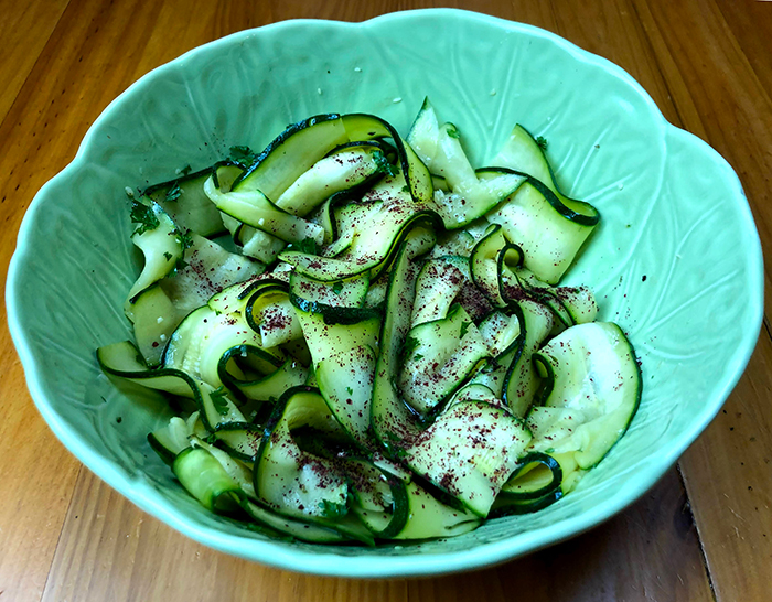 Serve it with a fresh salad like this one of finely shaved zucchini (courgette) strips dressed in a lemony vinaigrette and sprinkled with sumac, salt and freshly ground black pepper.