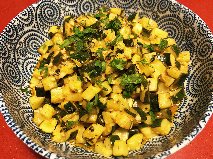 Wash and chop 750 g (1½ lbs) of fresh zucchini into small cubes. Heat ¼ of a cup of olive oil in a saucepan over medium heat and add the zucchini, 2-3 cloves of minced garlic, 1 teaspoon of salt and 1 teaspoon of paprika (hot or sweet). Cover and cook until the zucchinis are just beginning to become tender. Add 2 tablespoons of lemon juice, 2 tablespoons of chopped fresh parsley and ¼ of a teaspoon of ground cumin and continue to cook until tender. Taste and adjust seasoning or add more lemon juice if desired. Serve warm or at room temperature.