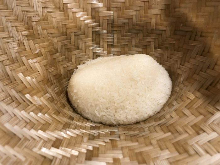 This meal wouldn’t be complete without the Lao staple of sticky rice (Khao Neow), an opaque short-grain rice with low amylose content which becomes especially sticky when cooked. It requires soaking before it is steamed in a woven steamer. Sticky rice is eaten using fingers.