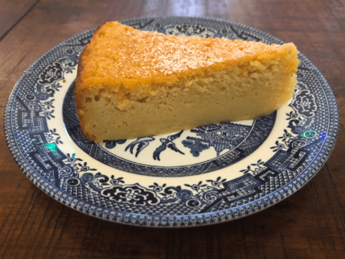 In a wide saucepan, simmer 4 cups of apple cider vinegar until it reduces to half a cup. Let it cool completely. Preheat your oven to 160ºC (325ºF). In a clean bowl whisk 4 egg whites to stiff peaks. If you’re using a stand mixer, transfer the egg whites to another bowl and set aside. Melt 120g (4¼ oz) of butter and let it cool a little. Meanwhile, whisk 4 egg yolks and 1½ cups of powdered sugar until pale yellow. While whisking, add the cooled butter, the apple cider vinegar reduction and 1 teaspoon of pure vanilla essence. If your butter is unsalted, add ½ a teaspoon of salt as well. Mix until everything is blended. Add 1 cup of all-purpose flour and continue to whisk until well combined. Next add 1¾ cups milk. When the milk is fully incorporated, fold the egg whites into the mixture with a spatula. Pour the batter into a greased and lined 22cm (9″) cake tin and bake for 45 – 50 minutes or until the cake no longer wobbles. Cool the cake for at least 1 hour before serving.