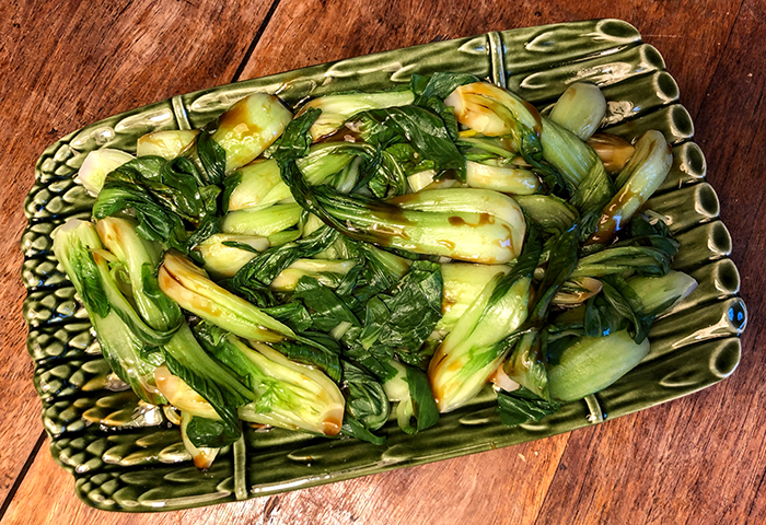You will need some Sichuan pantry staples – Sichuan peppercorns, spicy bean paste (doubanjiang) and homemade chilli oil – for this recipe. If you don’t have any chilli oil, it’s quite easy to make. Or, if you just want to make enough for this recipe just heat some oil, add chilli flakes and cook until fragrant and crisp but not burnt. Set aside for later. Heat a dry pan and roast 4 – 5 teaspoons of Sichuan peppercorns. When they have cooled, grind them coarsely. Meanwhile, heat some oil in a wok and add 8 minced cloves of garlic and an equivalent amount of finely minced fresh ginger. Add ¾ of the ground Sichuan peppercorns and 340g (¾ lb) of minced pork, breaking it up while it’s cooking. When it’s cooked through add ¾ – 1 cup of chicken stock and 1 tablespoon of spicy bean paste. Make a slurry of 3 teaspoons of cornflour (cornstarch) with some cold water and, while stirring, add it to the simmering sauce. When it thickens add 500g (1 lb) of classic soft tofu cut into cubes and let it heat up in the sauce. Finally, add a few tablespoons of chilli oil, including the chilli. Check for seasoning and adjust according to taste. Garnish with the remaining Sichuan peppercorns and some chopped spring onions (scallions). Serve with steamed rice and green vegetables like these baby bok choy (pak choi) with oyster sauce.