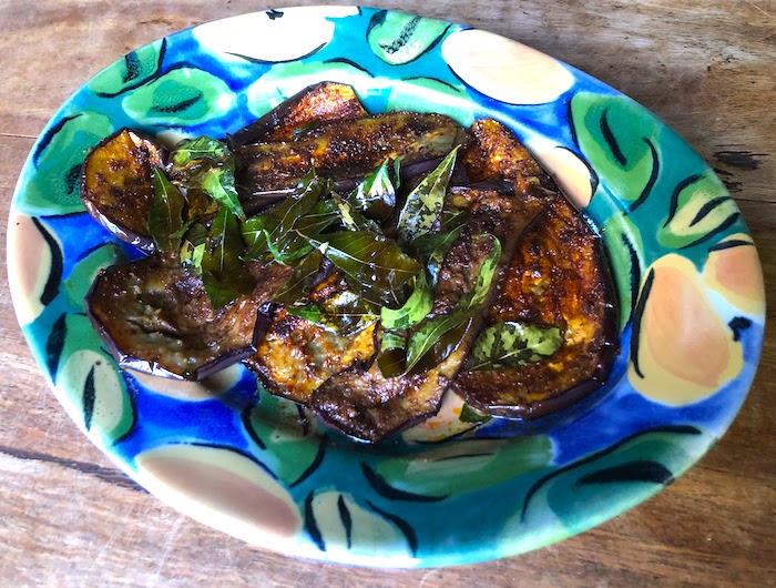 Slice 1 large or 2-3 smaller eggplant lengthwise into thin slices. Coat each slice with some oil and dip them into a mixture of Kashmiri chilli powder, ground coriander and salt to taste. Fry the slices in a non-stick frypan until browned on both sides and soft in the centre. Garnish with fried curry leaves.