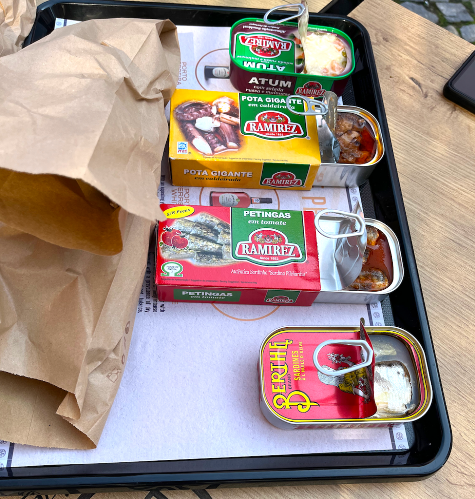 Today the appeal of conservas is still strong. During the Covid19 pandemic, the Portuguese Directorate of General Health produced a 37-page guide Canned Recipes: Healthy Eating in Times of Isolation Using Canned Fish and Legumes. Here are some from a market in Porto, served straight from the can with crusty bread.