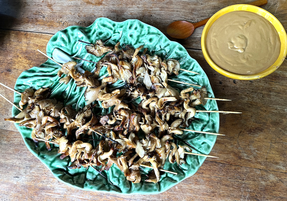 First, soak some bamboo skewers in warm water for 30 minutes. Meanwhile, make the satay dipping sauce. In a small food processor combine 4 tablespoons of peanut butter (I used natural crunchy) with 2 tablespoons of sweet soy sauce, 50ml (1¾ fl oz) of coconut milk, 1 fresh chilli, 3 teaspoons of lime juice, 10g (⅓ oz) of fresh ginger and salt to taste. Process until you have a smooth sauce, adding more coconut milk if necessary. Tear 450g (1 lb) of oyster mushrooms into strips and thread them onto the skewers. Next make a basting sauce by combining 1½ tablespoons of sweet soy, 1 teaspoon of ground coriander and 5 tablespoons of sesame oil. If you have a charcoal grill, baste the skewers on each side as you cook them. If not, lay the skewers on a baking paper lined tray, baste with half of the sauce and cook under a hot grill (broiler) or in a hot oven. Turn and baste again before cooking on the second side.