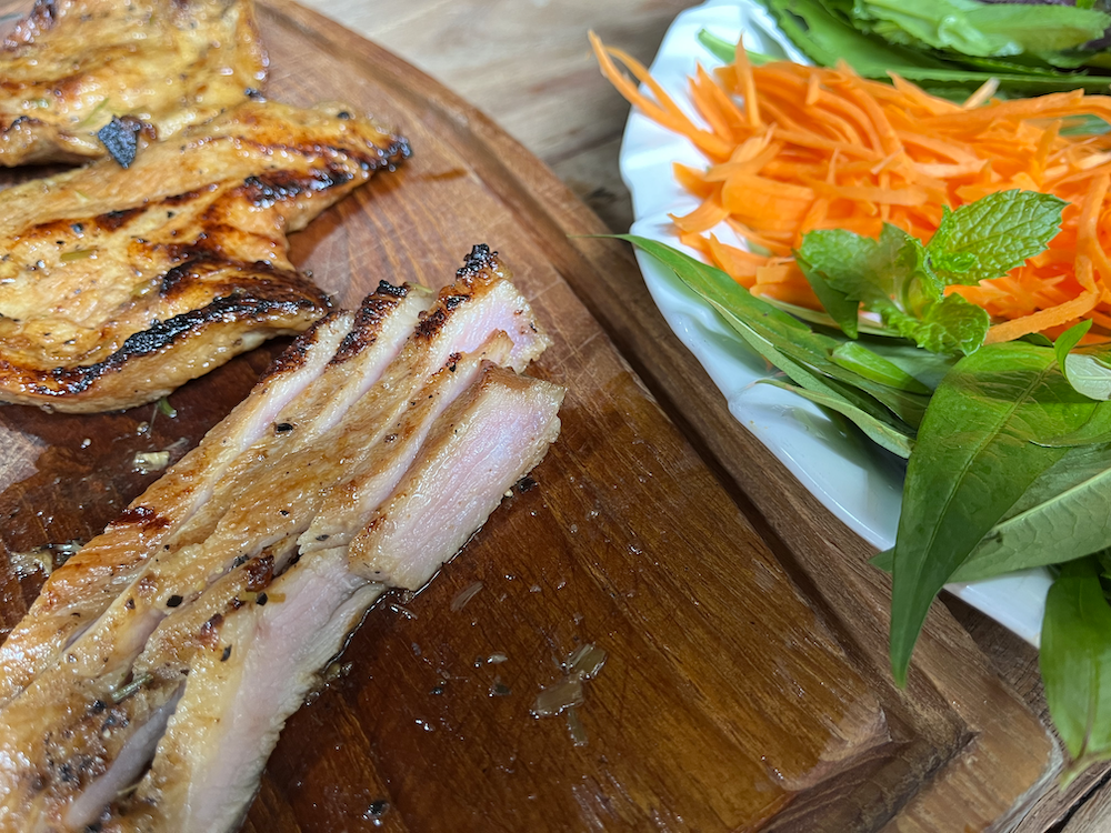 In a food processor combine 6 cloves of garlic, 5–6 stalks (without leaves) of coriander (cilantro), 2 tablespoons of chopped lemongrass (white part only), 2 tablespoons of oyster sauce, 1 tablespoon of soy sauce, 1 teaspoon of black peppercorns, 2 tablespoons of palm sugar and a pinch of sea salt. Process to a smooth sauce. Pour the marinade over the pork cheeks and mix well to combine. Cover and refrigerate overnight. Before cooking, bring the pork cheeks back up to room temperature. If you don’t have a charcoal grill, use a gas barbecue or a hot grill (broiler). If you do have charcoal, make sure to turn the cheeks often so the sugar doesn’t burn too much. They should only need about 5 minutes a side and should be a little caramelised when cooked. Rest them for a few minutes before slicing thinly. I served mine with lettuce for wrapping, shredded carrots, fresh herbs and a dipping sauce. For the sauce combine 1 red shallot, 1 garlic clove, 1 Thai red chilli, 5–6 sprigs of fresh coriander (cilantro), 2 tablespoons of fish sauce, 1½ tablespoons of palm sugar, 1½ tablespoons of lime juice and 3 tablespoons of water in a blender. Blend until smooth and let it sit for 10-15 minutes before using.