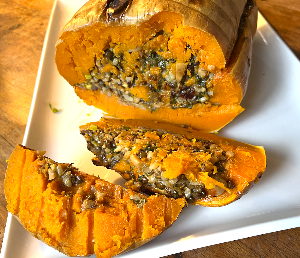 This stuffed and roasted butternut pumpkin (squash) is a beautiful thing to behold and delicious too! An excellent centrepiece for a vegetarian/vegan feast or as part of a celebration. Cindy cooked this one for just such an occasion. A winning recipe from the book RECIPETIN EATS: DINNER by Nagi Maehashi.