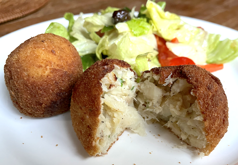 Bacalhau is the Portuguese word for cod, specifically dried and salted cod. In Portugal some say there are more than 365 ways to cook bacalhau, one for every day of the year; others say there are 1,001 ways. However you look at it, bacalhau is an iconic and ubiquitous ingredient of Portuguese cuisine. It was once a cheap ingredient until the collapse of cod stocks in 1992 and the subsequent dismantling of the Portuguese bacalhoeiro fleet. David made these delicious fried cod balls (croquettes) to remind us of our travels on the Iberian Peninsula. Enjoy them as an appetiser with drinks or as a meal with salad.