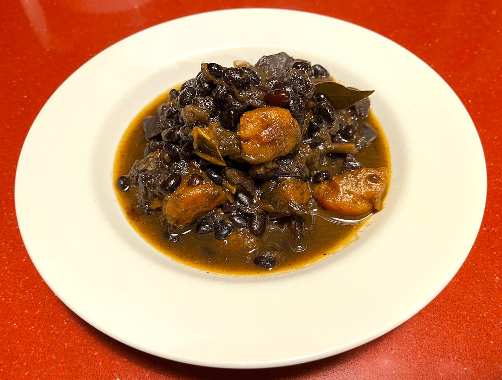 You can soak the black beans overnight or use the following quick-soak method. Add 1½ cups of black beans and 6 cups of water to a pot or pressure cooker and bring to a boil. Simmer for 4 minutes then remove from the heat and leave the beans to soak for 1 hour. Now you’re ready to cook. In a frypan brown 450g (1 lb) of skinless pork belly or pork short ribs. When they’re brown on both sides add them to the beans. Next, fry a chopped onion until translucent then add a small green pepper and a red or yellow one and cook for a few more minutes. Add them to the pot of beans. Now chop a chorizo of your choice, fry it and add it to the pot along with some chunks of carrot, 2 bay leaves, ½ a teaspoon of dried thyme, ½ of a teaspoon of ground cinnamon and ¼ of a teaspoon of ground allspice. If you’re using a pressure cooker, bring it to pressure and cook for 15 minutes then open and cook for a further 15 – 30 minutes to reduce the liquid. If you’re cooking in a pot, simmer over low heat for 1 – 1½ hours or until the beans are soft.