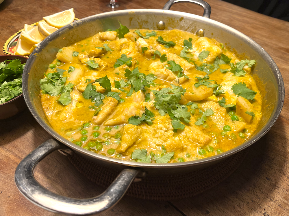 In a food processor blitz 3 tablespoons of olive oil with 2 banana shallots, 2 cloves of garlic, 1 heaped teaspoon of preserved lemon rind, 1½ heaped teapoons of ground cumin, ½ a teaspoon of paprika, 2 tablespoons of finely chopped coriander (cilantro) and 200g (7 oz) of cherry tomatoes. Season with salt and pepper to taste and transfer to a wide, deep pan with a tight-fitting lid. Add 200g (7 oz) of small waxy potatoes cut into slices, cover and bring to a simmer over a medium to high heat. Cook for 5 minutes before adding enough fish for 4 plus 200g (3½ oz) of frozen baby peas. Cover again and cook for a further 5-8 minutes until the fish is just cooked through. Remove from the heat, turn the fish over and leave to rest for 5 minutes. Check for seasoning and serve garnished with coriander leaves and drizzled with some good quality olive oil. Make sure you have some lemon wedges available.
