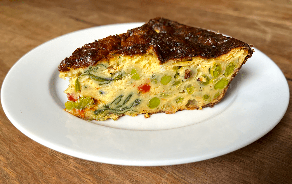 Impossible pie is so named because it’s impossibly easy. It’s origin is unknown but in the 1970s and 80s it became one of the most successful food marketing strategies in the U.S. for both General Mills (Betty Crocker) and General Foods (now Kraft General Foods). It can be adapted to any kind of pie, savoury or sweet, and eliminates the need to make a separate crust although that crust doesn’t resemble a shortcrust pastry, rather more like a cake. Ingredients in this quiche include spinach, peas, sun-dried tomatoes and pesto.