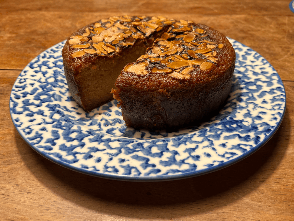 Preheat your oven to 180°C (350°F). Grease a 20cm (8″) round cake tin and line with baking paper. In a bowl whisk together 1 cup of plain flour, 1½ teaspoons of baking powder and ½ a teaspoon of salt. In another bowl or stand mixer cream 1 cup of (room temperature butter) with ⅔ of a cup of honey until smooth and fluffy. Add 1 egg (also room temperature) and mix briefly before adding ¼ of the flour mixture. Mix well and repeat this process 3 more times until you have used 4 eggs abd all the flour mixture and you have a good smooth batter. Stir in 3 tablespoons of milk and a pinch of orange zest. Transfer the batter to the cake tin and smooth the surface. Sprinkle with ⅓ of a cup of flaked almonds. Bake for 45 minutes until a cake tester comes out clean. Remove from the oven and cool in the pan for 30 minutes. Meanwhile, in a small saucepan combine ⅔ of a cup of honey with ¼ of a cup of water and bring to boil. Simmer for 5 minutes. Add ¾ of a teaspoon of lemon juice and continue to simmer for another 2 minutes. Remove from the heat and cool for 10 minutes. When the cake has cooled for 30 minutes poke about 30 holes into the cake between the almond flakes. Pour ¼ of the honey syrup over the cake and allow it to soak in. Repeat 3 more times until all the syrup has been absorbed. Allow it to sit for another 15 minutes. Remove the cake from the pan and the paper from the cake and serve warm with a dollop of sour cream.