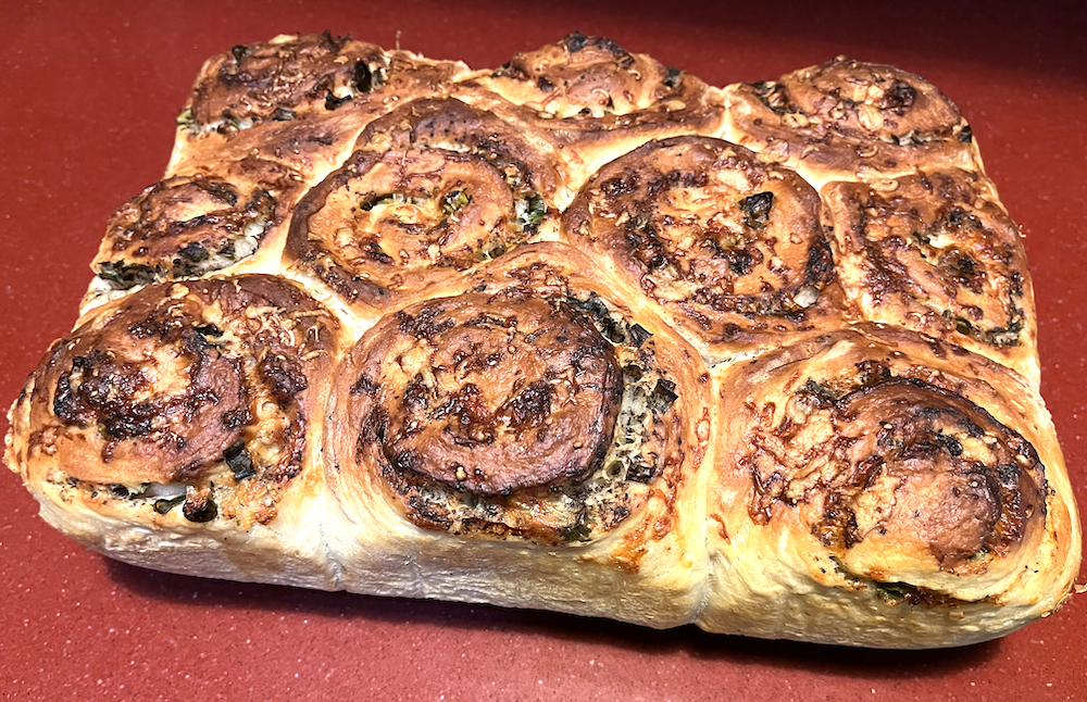 To make the dough combine 200g (7g) of strong bread flour with 600g (1⅓ lb) of plain white flour. Add 3 teaspoons of bread improver, 2 teaspoons of salt, 4¼ teaspoons of dry active yeast and ⅓ of a cup of finely grated parmesan cheese. Use a stand mixer with a dough hook or mix by hand with approximately 600ml (20 fl oz) of very warm water. Add ¾ of the water first and use as much as you need to make a moist dough. Knead the dough for a few minutes then cover and let it rise in a warm place. When doubled in size, sprinkle some flour on a working surface and fold the dough a few times. With a rolling pin, roll it into a large rectangular shape. Spread truffle paste over the rectangle to taste, followed by grated tasty cheese and chopped spring onions (scallions). If you prefer you could use parsley instead. Roll tightly into a log shape. Cut the log into 12 thick slices and arrange them cut side up in a prepared rectangular baking dish. Preheat your oven to 200ºC (390ºF). Leave the scrolls in a warm place to rise again. When doubled in size, brush them with a little milk and sprinkle with some more grated cheese. Bake for 20 – 30 minutes until golden brown.