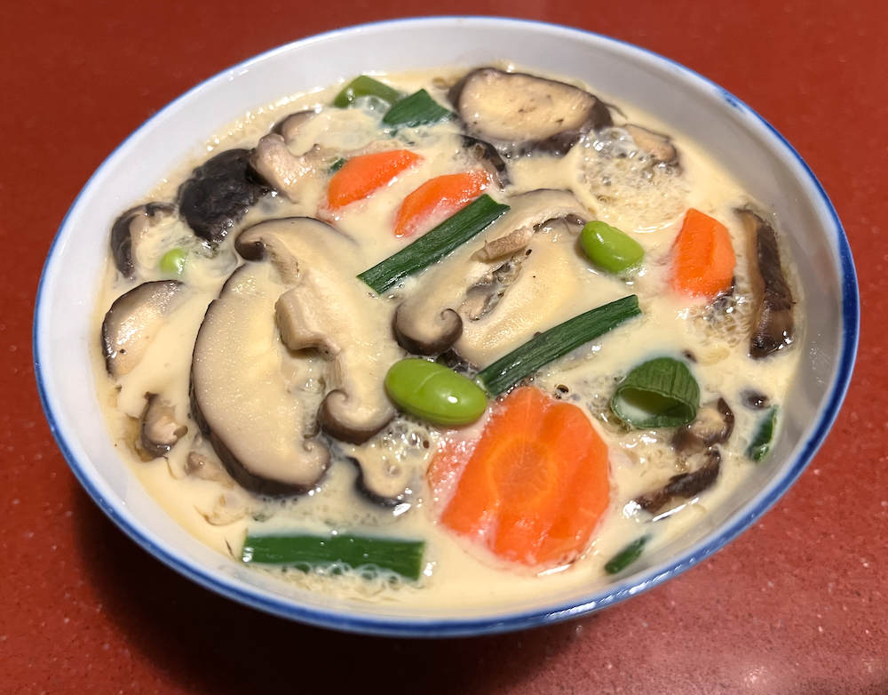 In a saucepan heat 2½ cups of dashi (I used instant dashi stock) with 3 teaspoons of sake, 1½ teapoons of soy sauce and 1 teaspoon of salt. Heat to dissolve the salt and then cool completely. Meanwhile prepare your ingredients. Mine consisted of sliced fresh shiitake mushrooms, sliced carrot, lengths of spring onions (scallions) and frozen edamame. In a bowl mix 4 large eggs well with a fork (do not beat). When the dashi mix is completely cooled, pour it into the eggs in a slow steady stream and mix gently. Strain the egg mixture through a very fine sieve or cheesecloth. Place your prepared ingredients into 4 individual rice bowls then carefully ladle ¼ of the egg mixture into each bowl leaving at least 1.3cm (½”) at the top. Place the bowls in a steamer over at least 2.5cm (1″) of boiling water. Cover with a vented lid or leave a little space for some steam to escape. Gently steam for 15-20 minutes until a toothpick inserted into the custard comes out clean. Serve hot with a spoon.