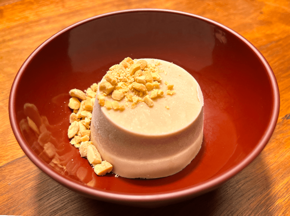 Pour 1 can of organic coconut cream into a saucepan and add 2 stalks of lemongrass (bruised and cut into shorter lengths) ¼ of a cup of yuzu juice, 2 tablespoons of corn syrup and ⅓ – ½ a cup of palm sugar. Palm sugar can vary in sweetness so taste the mixture to make sure you have the right amount. Bring the mixture to a simmer for a few minutes then set aside to cool. When cool, remove the lemongrass and place the mixture in a high speed blender. Add ¼ – ½ a teaspoon of salt to taste and ⅛ of a teaspoon each of xantham gum and guar gum (optional). Chill in the fridge overnight. Churn in an ice cream machine then freeze for a few hours. Serve garnished with chopped peanuts.