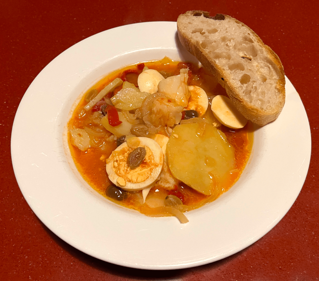Soak 450g (1 lb) of salt cod (wet or dry) in at least 2 litres (quarts) of water, changing the water three times over the course of 12 hours or so. Drain the fish and cut it into bite-sized pieces. Assemble the ingredients you will need: 4 sliced potatoes, 2 sliced onions, 4 sliced large hard-boiled eggs, 2 teaspoons of drained capers, 2 large minced cloves of garlic, ¼ of a cup of pitted green olives, a drained and sliced 120g (4 oz) jar of roasted red bell peppers and ½ a cup golden raisins. In a pot with a lid place half of the fish and half of each ingredient in the same order as above. Place a bay leaf on the raisins, then pour ½ a cup of tomato puree or passata and ¼ of a cup of olive oil over the top. Repeat all the layers again. Lastly pour in 1 cup of water and ¼ of a cup of white wine. Cover without stirring and bring to a boil, simmering for about 30 minutes or until the potatoes are tender. In Puerto Rico this dish is served with white rice and root vegetables. I served it with crusty white bread.