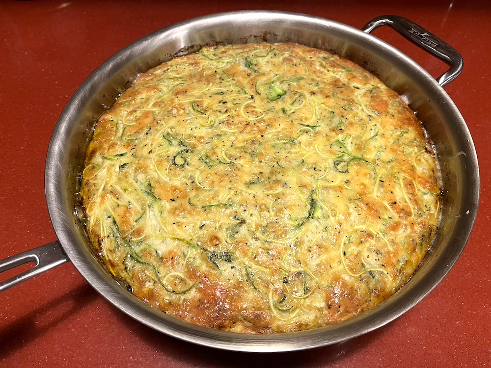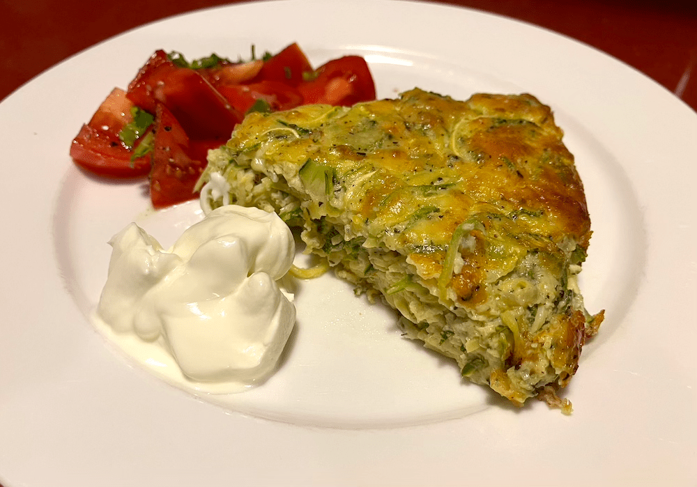 Preheat your oven to 180ºC (350ºF). In a frypan heat 1-2 tablespoons of olive oil and gently fry 1 finely diced onion until soft and transluscent. Stir in 1 teaspoon of freshly grated nutmeg and 1 teaspoon of dried mint and remove from the heat. While the onion mixture cools, pour another 1-2 tablespoons of oil into an ovenproof pan in which you intend to cook the omelette and heat it in the oven. Coarsley grate or spiralise 4 white zucchinis and set aside. In a large bowl whisk 6 eggs until frothy then whisk in 2 tablespoons of self-raising flour, the grated zest of one medium lemon and ½ a teaspoon each of salt and freshly ground black pepper. Squeeze as much moisture out of the zucchinis as possible and add them to the eggs along with 200g (7 oz) of a melting cheese. Pour the mixture into the hot pan. Cover with a lid or foil and bake for 15 minutes or so until nearly set. Remove the lid and bake for a further 15 minutes until brown. Serve hot with thick yoghurt or serve cold with pickles or relish.