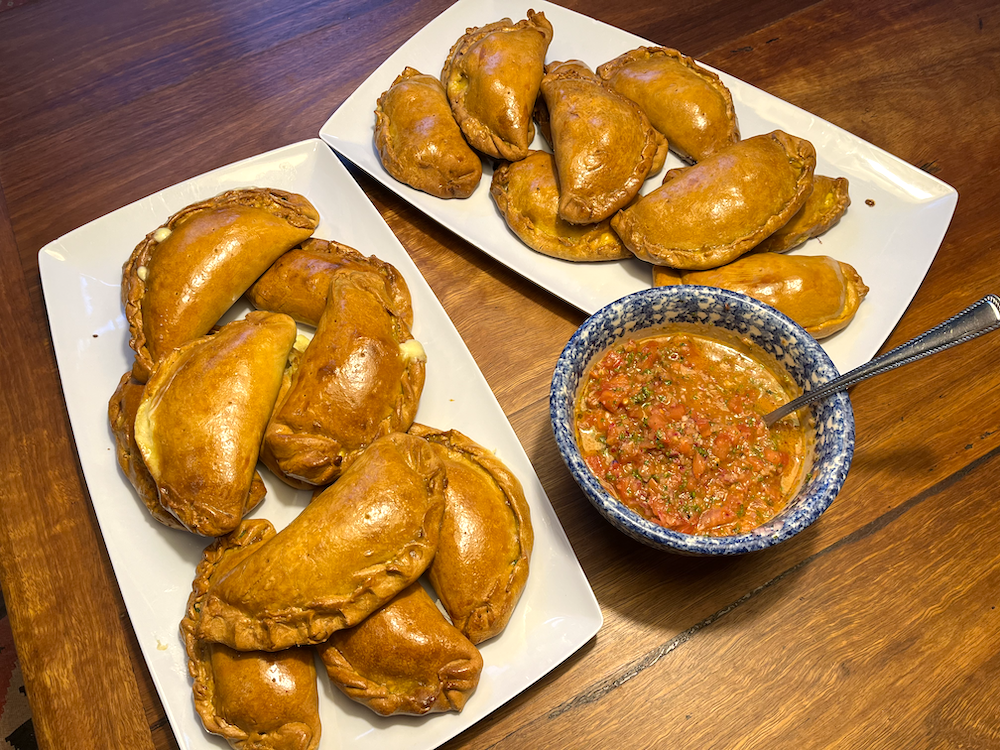 Empanadas are the ubiquitous South American or Spanish pie – a pastry turnover with a filling of meat or cheese which is either baked or fried. Ours were baked with 2 different fillings: a corn and cheese filling and because we’re in Australia a lamb filling. Our Chilean friend Inês supplied Jane with the pastry recipe. We served them with a tomato, fresh parsley and oregano salsa.