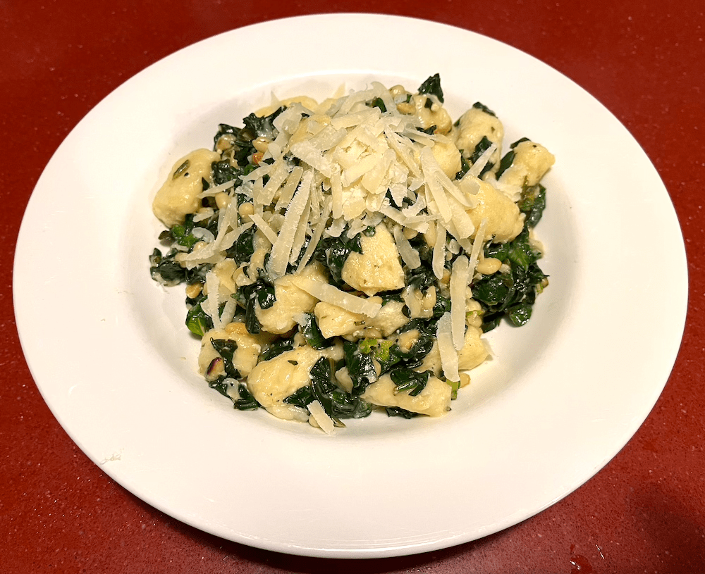 To make the gnocchi, combine 340g (12 oz) of fresh full-fat ricotta with 2 whole eggs, ¾ of a cup of plain flour and ⅓ of a cup of finely grated parmesan. Mix with a pastry cutter or fork. When the mixture is well combined, flour a work surface and roll the mixture into sausage shapes before cutting into short lengths to make the gnocchi. Lay the gnocchi out on a plate and refrigerate before cooking. Wash and spin dry a large bunch of fresh spinach then roughly chop. Have your other ingredients ready: olive oil, 2 minced cloves of garlic, 2-3 teaspoons of lemon juice, salt, freshly ground black pepper and 1 tablespoon of toasted pine nuts. Bring a large pot of salted water to a rolling boil. Carefully drop the gnocchi into the water – they will only take a few minutes to cook. When they float to the top of the water they’re cooked but I like to leave them for a minute longer. Use a spider or strainer to remove them from the water and allow them to drain. Now heat a tablespoon of olive oil in a large pot or frypan. Sauté the garlic briefly then add the spinach and lemon juice and season with salt and pepper. Toss the spinach with tongs and when it’s barely wilted, add the gnocchi and toss the spinach through them using a wooden spoon or spatula. Turn off the heat and add the pine nuts, mixing them through briefly. Serve topped with some freshly grated parmesan.