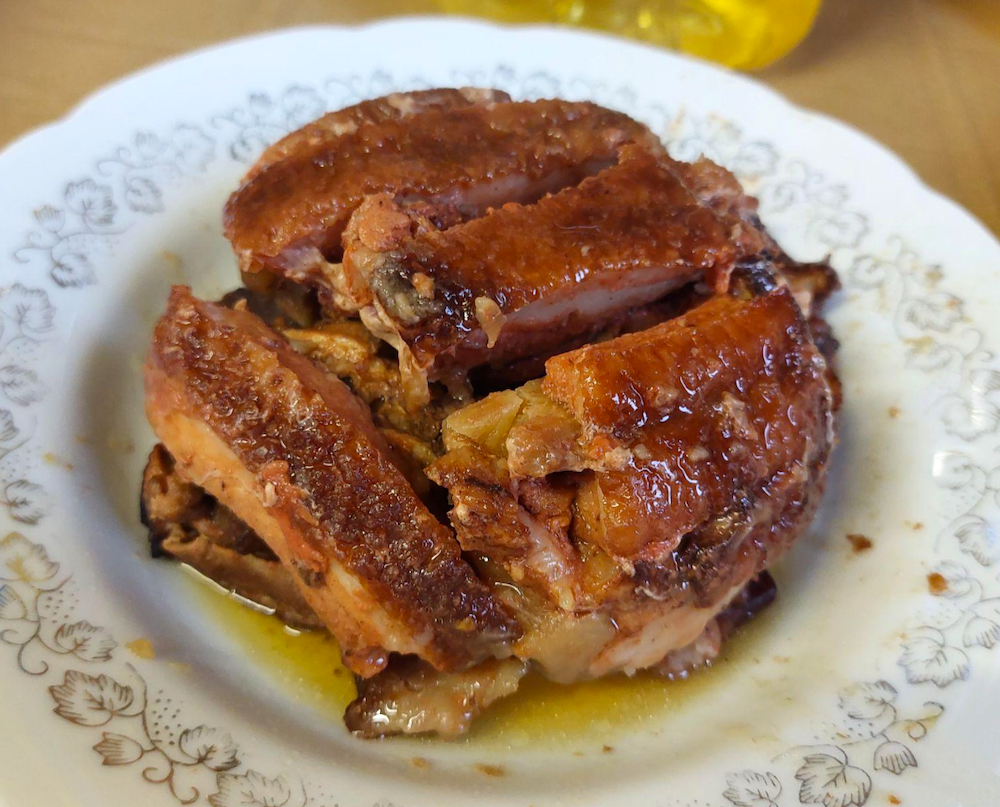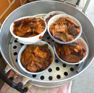 .When you’re ready to cook, steam the bowls for 2½ hours. To serve, turn the pork out onto a plate with the skin side up (see first image).