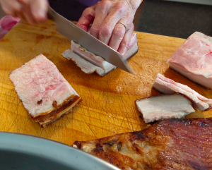When the pork is done, soak it in cool water for 10 minutes – this will improve the texture and aid with slicing. Fry the liver for approximately 20 mins until dark brown and well cooked. Soak in cool water once fried. Discard the oil after frying the liver. Once the pork has cooled in the water, you can start to slice it into pockets: Remove any bones keeping as much of the meat intact as possible.