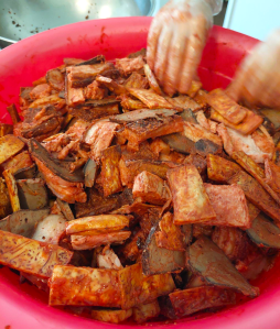 Place the pork belly skin side down on the chopping board and start cutting it into pockets: Make the first cut down to the skin without cutting through, then make a second cut to remove the pocket from the rest of the belly. Each pocket should be approximately 2cm (¾’) thick and 6-7cm (2¾’) long. Chop any remaining pork belly with bones into chunks using a cleaver. Remove and discard the tough skin of the liver and slice into very thin strips approximately the same length as the pork belly pockets. In a large bowl mash 150g (5¼ oz) of fermented red bean curd to a smooth consistency.