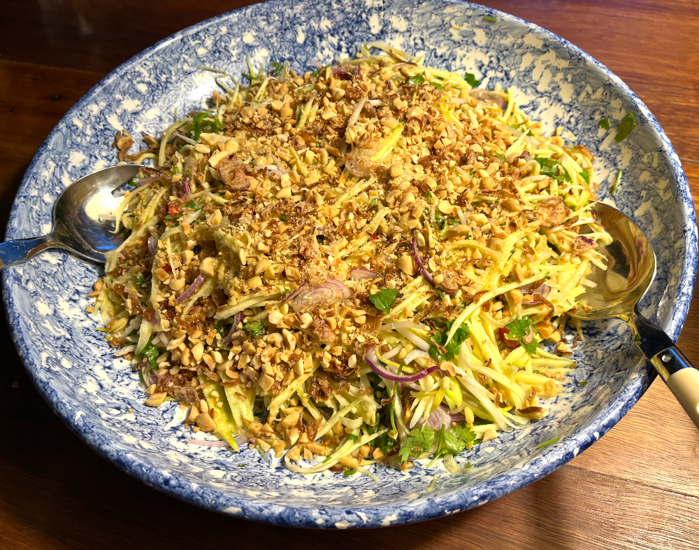 In a bowl combine 2 shredded green mangoes, 100g (3 oz) of bean sprouts, 4 thinly sliced red Asian shallots, I thinly sliced and de-seeded long red chilli, 2 minced garlic cloves, a handful of roughly chopped coriander (cilantro), and 3 tablespoons of chopped roasted unsalted peanuts. If you’re planning to include beef, heat some vegetable oil in a frypan and cook a 300g (10½ oz) trimmed piece of beef fillet until browned on all sides and just medium rare. Remove from the pan and allow to rest for 10 minutes before slicing very thinly. Add the beef slices to the salad. For the dressing, combine 120g (4¼ oz) of caster sugar with 100ml (3ā fl oz) of lime juice and 3 tablespoons of fish sauce (Vietnamese fish sauce is milder than Thai – I recommend Viet Huong Three Crab Fish Sauce). Stir until the sugar has dissolved then pour the dressing over the salad ingredients and gently toss. Sprinkle 2 tablespoons of fried shallots over the top (you can buy these ready to use from Asian stores) and serve.