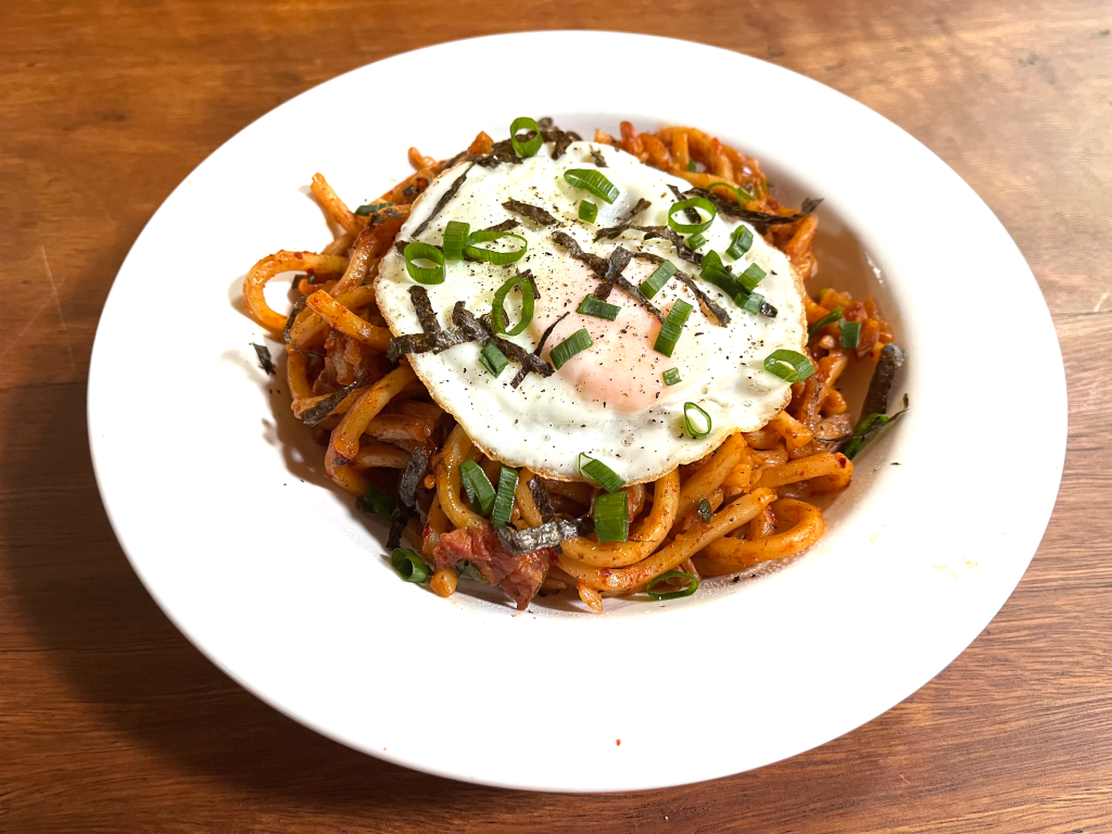 First make the sauce by combining 1 tablespoon of Korean chilli (gochugaru), ½ a tablespoon of Korean chilli paste (gochujang), 1 tablespoon of soy sauce, 1 tablespoon of honey, 1 tablespoon of raw sugar, a small minced clove of garlic, 1 teaspoon of sesame oil and 1 teaspoon of rice vinegar (optional) for extra tang. Boil the udon noodles (according to instructions on the pack), ideally not long before you intend to fry them so they don’t stick together. Drain and set aside. Heat a large frypan over medium/high heat and then add a little cooking oil. Fry 120g (4¼ oz) of bacon cut into slivers and cook for a few minutes. Add 1 sliced onion and fry briefly before adding 1 cup of chopped aged kimchi. Cook for a few minutes then add the sauce and mix well. Add the udon noodles and mix through. Add 30g (1 oz) of thinly sliced green onions and stir briefly. Serve the noodles garnished with all or some of the following: a fried egg, ground black pepper, sliced green onions, sesame seeds, strips of toasted seaweed.