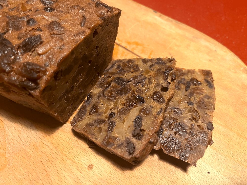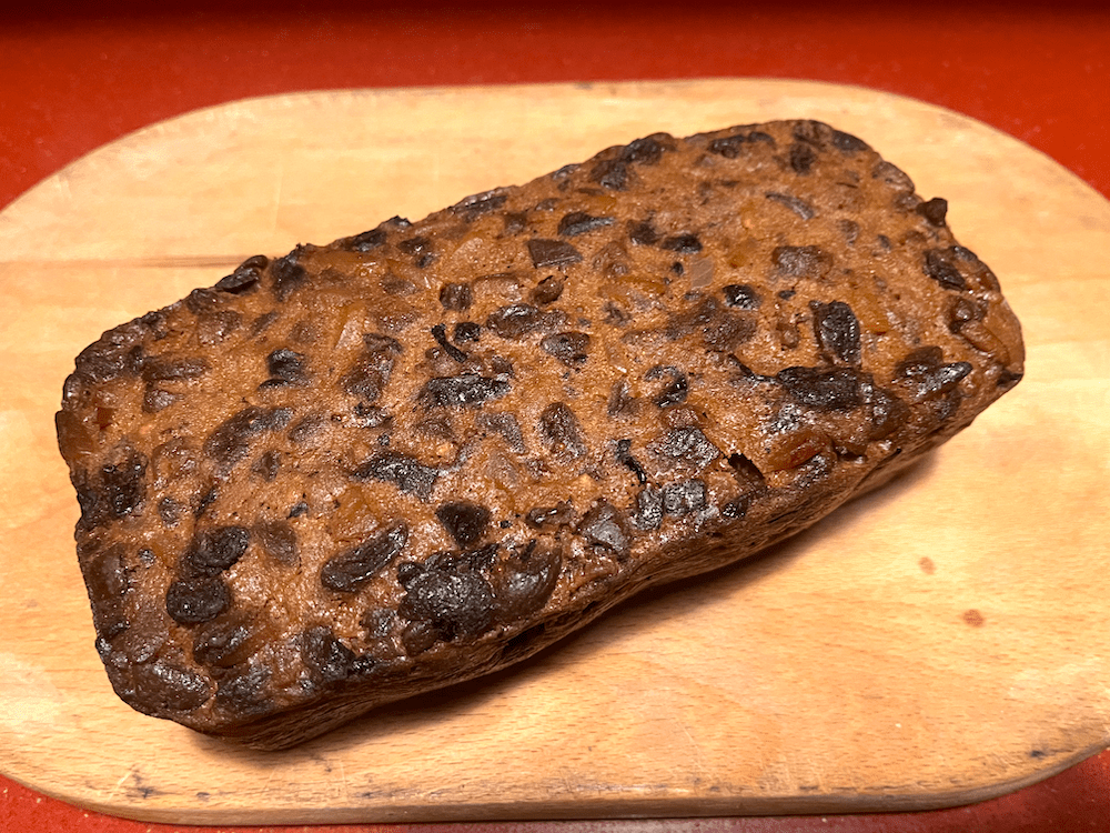 First chop 300g (2 cups) of dried apricots, 160g (1 cup) of unsweetened black figs, 160g (1 cup) of unsweetened sour cherries and 120g (¾ of a cup) of dried unsweetened prunes. Add 200g (1¼ cups) of dark raisins and 200g (1¼ cups) of golden raisins and mix to combine. Put the dried fruit into a deep bowl or glass jar and add 1 cup of spiced rum. Leave the fruit soaking for at least 24 hours or up to 4 weeks. When you’re ready to make the cake, preheat your oven to 150°C (300°F) and grease and line 2 loaf pans. In a mixing bowl whisk 180g (1½ cups) of unbleached all-purpose flour, ½ a teaspoon of baking powder, 1 of teaspoon ground cinnamon, 1 teaspoon of ground ginger, ¼ of a teaspoon of freshly grated nutmeg and 1 teaspoon of salt. Set aside. In a bowl or stand mixer with paddle attachment, cream 115g (4 oz) of softened butter and 160g (¾ of a cup) of light brown sugar together until light and fluffy. Carefully add 5 large room temperature eggs, one at a time, beating just until each egg is incorporated. The mixture will look slightly broken. Slowly add the flour mixture until just absorbed. Stir in 1 tablespoon each of freshly grated lemon and orange zest, 120ml (½ a cup) of fresh orange juice, 1 peeled and coarsely grated apple, 90g (¾ of a cup) of toasted slivered almonds, and 3 tablespoons of finely diced crystallised ginger. Add the soaked dried fruit mixture along with any liquid that hasn’t been absorbed and finally, 100g (⅔ of a cup) of chopped bittersweet chocolate.. Stir the mixture well to make sure all of the ingredients are evenly incorporated. Divide the batter evenly into the loaf pans and smooth the top. Put the loaf pans in the centre of the oven and bake for 1¼ – 1½ hours, rotating the pans halfway through, until set and golden brown. Remove from the oven and cool completely before removing from the pans. When cooled, soak some cheesecloth in spiced rum and wrap the cakes in the cheesecloth, followed by wax paper and foil and finally in a plastic bag. Keep in the fridge. Remove weekly and either re-soak the cheesecloth or brush the cakes with rum. Serve this boozy cake with some vanilla custard,