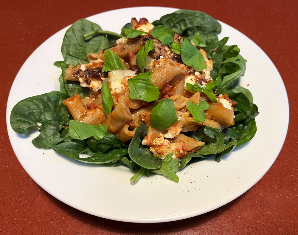 Heat your oven to 220ºC (425F). Heat some olive oil in an ovenproof pan or skillet over medium-high. Crumble 350g (¾ of a lb) of Italian sausage (we used pork and fennel sausage) into a skillet and use a spoon to break it into small pieces. Cook until it’s beginning to brown. Stir in 4 cloves of thinly sliced garlic, 1 teaspoon of dried oregano, ½ a teaspoon of coarsely crushed fennel seeds and a pinch of chilli flakes and cook for a further couple of minutes. Stir in one 800g (28 oz) can of whole peeled tomatoes with their juices and use a spoon to break them up. Add one 400g (14 oz) can of crushed tomatoes, 2 bay leaves and 2 teaspoons salt, and bring to a simmer. Simmer for 10 minutes until slightly thickened then stir in 340g (12 oz) of dried pasta (we used wholemeal penne) and 1 cup of water. Bring back to a simmer and cook for 2 minutes, stirring to prevent the pasta sticking. Remove from the heat and fold in about ⅓ of 225g (8 oz) of fresh mozzarella torn into chunks. Top with the other ⅔ of the mozzarella and dollops of ¾ of a cup of fresh ricotta. Sprinkle with ⅓ of a cup of finely grated parmesan, then transfer to the oven. Bake until the pasta is tender and the cheese is bubbly and lightly browned. Remove from the oven and let cool slightly before serving. Ours was served on a bed of fresh baby spinach leaves and topped with fresh basil, plenty of freshly ground black pepper and some more chilli flakes.