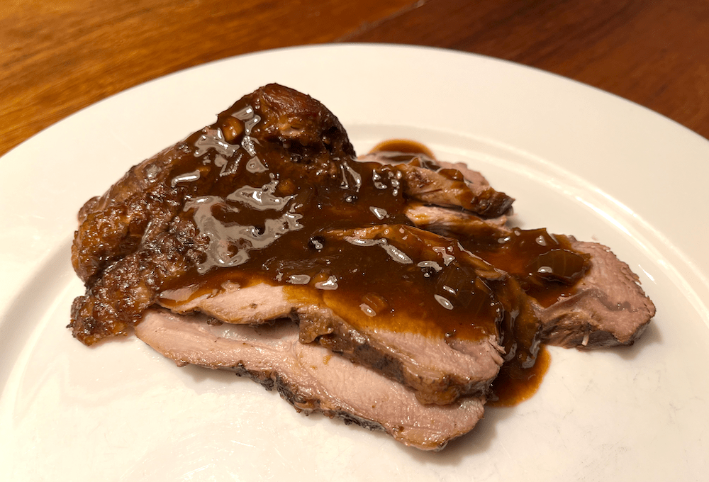 Heat some vegetable oil in a heavy oven-proof pot and brown the skin side of the turkey thigh well. Remove from the pot and if needed add a little more oil. Turn down the heat and add 5 cloves of minced garlic, 4 fresh bay leaves and 2 teaspoons of whole black peppercorns. Cook briefly (be careful not to burn the garlic) then add 2 cups of water, ½ a cup of soy sauce and ½ a cup of white vinegar. Return the turkey to the pot skin side up and simmer over low heat (adding more water as necessary) until the turkey is tender. When the turkey is ready add 1 teaspoon of sugar and season with salt to taste. If you wish you can brown the turkey thigh under the grill (broiler) for a few minutes. Slice and serve with plenty of the cooking sauce.