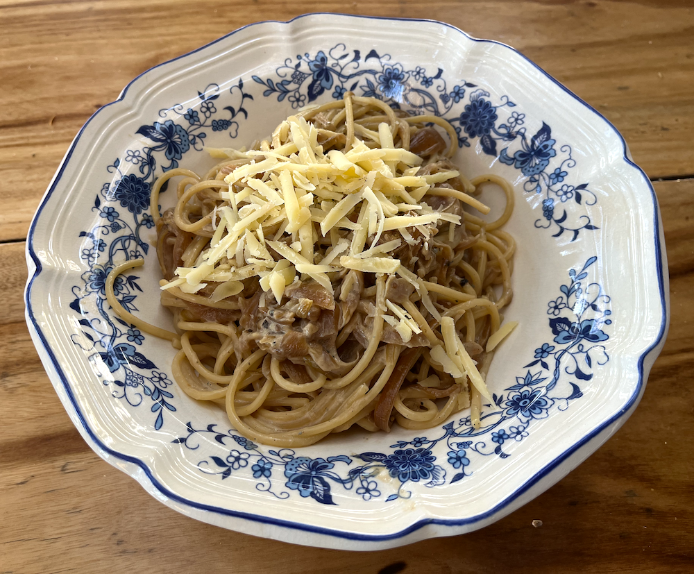 Melt some butter and oil in a wide pan and add 1.8kg (4 lbs) of sliced brown onions. Season generously with salt and add 1-2 teaspoons of brown sugar and a splash of balsamic vinegar. Cook over medium heat and when the onions begin to brown stir often. Take your time and eventually all of the onions will be soft and well browned. Meanwhile, bring a large pot of water to boil and add some salt. When the onions are nearly ready, cook a packet of good quality spaghetti for one minute less than the recommended cooking time. When the pasta is ready, drain it retaining some of the cooking water. Add the spaghetti to the caramelised onions with plenty of freshly ground black pepper and toss through, adding pasta water as needed to achieve a creamy sauce that sticks to the spaghetti. A little sour cream is also good for extra creaminess and tartness. Serve topped with freshly grated parmesan.