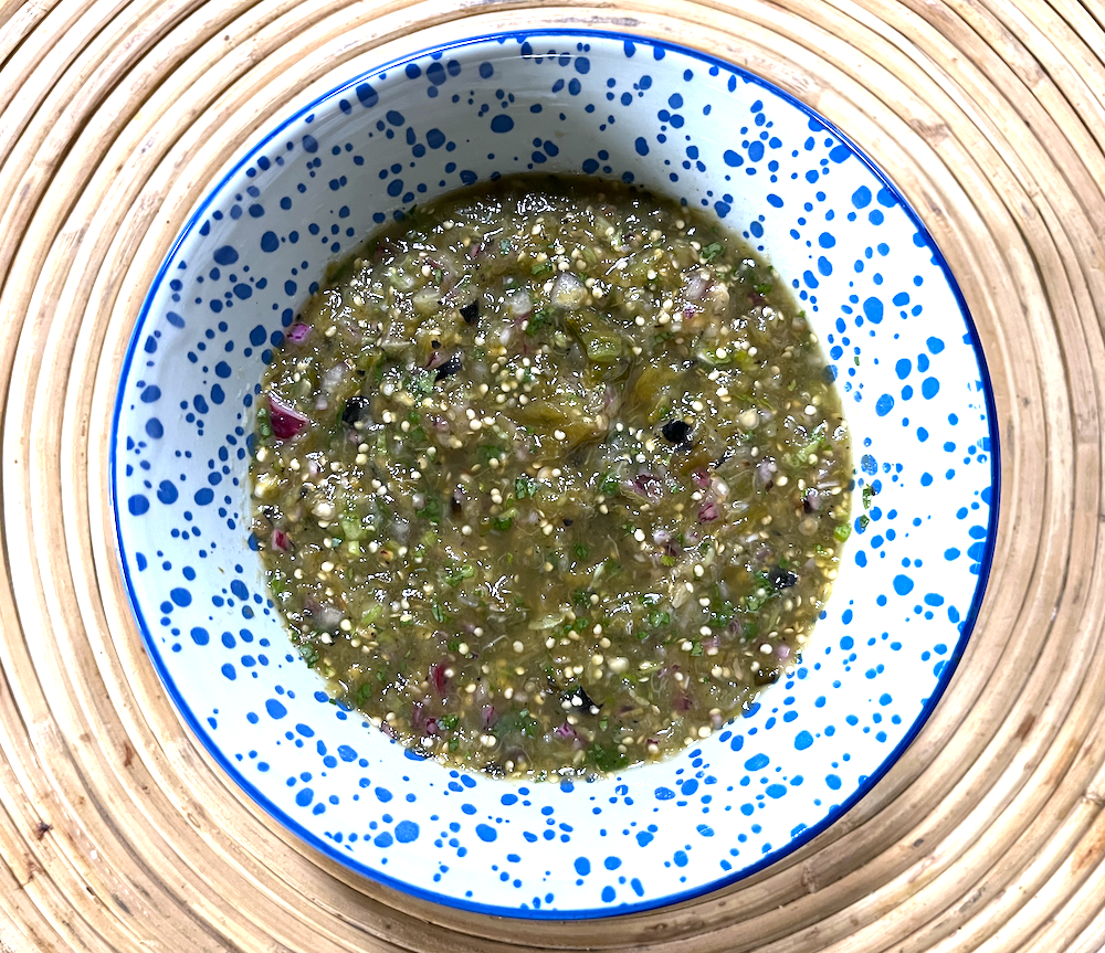 In a food processor or blender combine the well drained tomatillos (if you’re using fresh then char-grill them and retain all the liquid) with 2-4 coarsely chopped jalapeño or serrano chillies, ¼ of cup of chopped onion (soaked in cold water for 5 minutes then drained and rinsed), 1 peeled and roughly chopped clove of garlic, ½ a cup of coarsely chopped coriander (cilantro) and ¼ of a cup of water. Blend to a coarse purée. Taste and adjust seasoning and thin with water if desired. Transfer to a bowl and set aside for at least 30 minutes before serving to allow the flavours to develop.