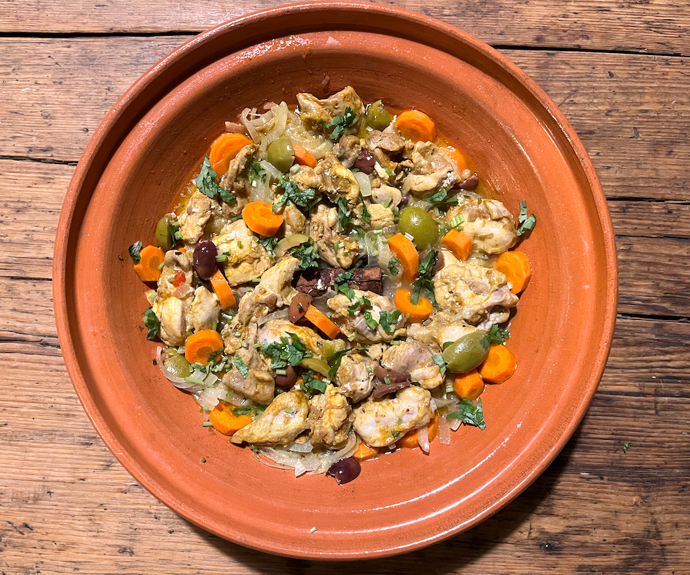 Mix 5 cloves of minced garlic with ¼ of a teaspoon of saffron threads, ½ a teaspoon of ground ginger, 1 teaspoon of sweet paprika, ½ a teaspoon of ground cumin, ½ a teaspoon of ground turmeric, ½ a teaspoon of salt and some freshly ground black pepper to taste. You can use a whole chicken cut into pieces or skin-on chicken thighs. Rub the chicken with the mixture then cover and refrigerate for 3 to 4 hours. When you’re ready to cook heat 2 tablespoons of olive oil in a tagine or heavy skillet. Add the chicken and brown on all sides. Remove to a platter. Now add 3 medium sliced onions to the pot and cook over medium-low heat until just beginning to brown. Add a cinnamon stick and layer the chicken onto the onions. Add some sliced carrots and scatter 16 halved olives (8 green and 8 Kalamata) over the chicken. Remove the pulp from a medium-sized preserved lemon and cut the skin into fine strips. Scatter over chicken. Mix 1 cup of chicken stock with the juice of 1 lemon and pour it over everything. Cover the tagine or skillet and cook over low heat for 20 – 30 minutes, until the chicken is done. Scatter parsley over the top and serve with couscous and salad.