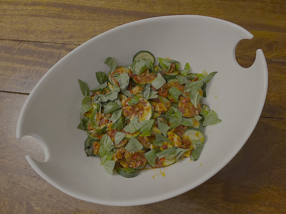 Heat 2 or 3 tablespoons of olive oil in a large sauté pan on medium heat and gently fry 6 finely sliced cloves of garlic until soft and aromatic but not brown. Remove half of the garlic, as well as some oil if there’s too much, into a small bowl and add 1 tablespoon of rose harissa, 1 finely chopped red chilli, ½ a finely chopped preserved lemon (skin only) and 1½ tablespoons of lemon juice. Stir to combine and set aside. Return the pan to the stove and turn the heat to high. Add 1kg (2.2 lbs) of finely sliced zucchini and 1¼ teaspoons of salt. Cook, stirring often, until the zucchinis are very soft but not brown and still holding their shape – about 18 minutes. Tear 10g (⅓ oz) of fresh basil leaves and stir half of them through the zucchini. Transfer to a serving platter and spoon the harissa mixture over the top. Allow to cool for at least 15 minutes then sprinkle with a pinch of salt and the remaining basil.